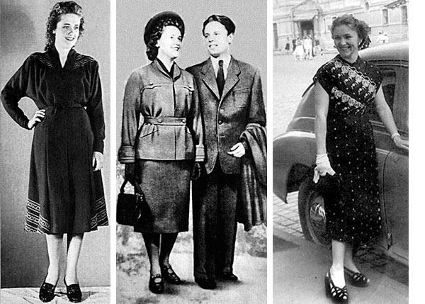 Длинные платья продолжали носить, однако имели более простую линию, были достаточно объемными и прятали женскую фигуру. Их шили в послевоенные годы без подложек и жесткости – все для того, чтобы упростить одежду, а не утруждать ее. Талия в первые послевоенные годы размещалась несколько ниже груди, с годами она снижалась.