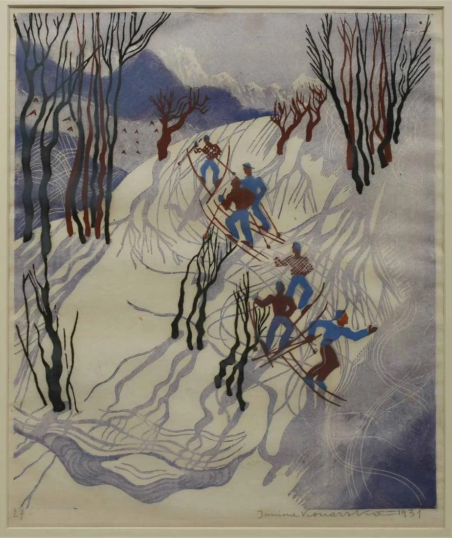 «Мої ксилографії народжувалися не з думкою про олімпійські змагання. Я була у Бретані в 1928 році. Під час однієї з моїх прогулянок, я була вражена краєвидом з тенісним кортом, я зробила першу гравюру на дереві, яка, як виявилося пізніше, поклала початок серії «Спорт у пейзажі». Ця серія включає дві ксилографії, надіслані до Лос-Анджелеса: «Стадіон» і «Лижники».